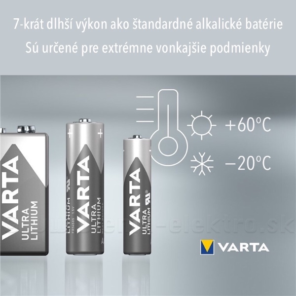 Ultra Lithium 1,5V batérie sú špičkové nenabíjateľné, jednorázové články od renomovanej spoločnosti VARTA, ktoré poskytujú extrémny výkon a dlhú životnosť. Ideálne riešenie pre moderné zariadenia s vysokou spotrebou energie, ako sú digitálne fotoaparáty, GPS navigácie, blesky, herné ovládače či inteligentné senzory. Výdrž až 7× dlhšia než pri bežných alkalických batériách (v zariadeniach s vysokou spotrebou), sú spoľahlivé aj pri extrémnych teplotách od -20 do +60 °C. Batérie VARTA sú v súčasnosti jednou z najuznávanejších batérií novej generácie.