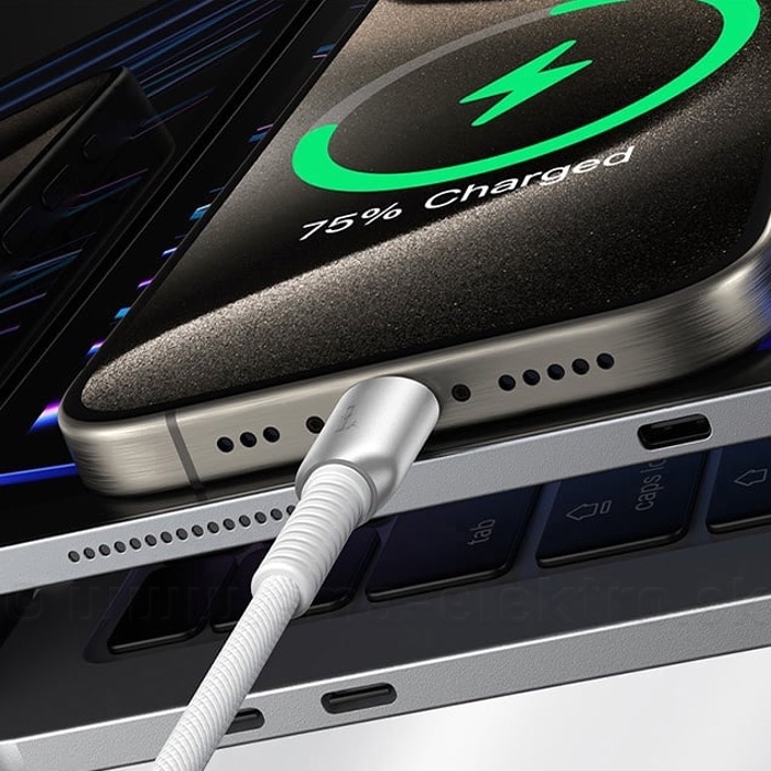 USB kábel Joyroom S-A51 je produkt, ktorý spája minimalistický dizajn, vysokú kvalitu spracovania a bezkonkurenčnú odolnosť. Bude ideálny na každodenné používanie aj do náročnejších podmienok. Vďaka rýchlemu nabíjaniu, odolnosti a bezpečnosti je vynikajúcou voľbou pre tých, ktorí hľadajú spoľahlivé príslušenstvo pre svoje zariadenia. Ak vám záleží na spoľahlivosti, pohodlí a štýle - tento kábel je určený práve pre vás. Kábel Joroom S-A51 sa vyznačuje nielen výnimočnou funkciou, ale aj osobitým dizajnom. Vďaka pružinovej koncovke je flexibilný a zároveň estetický. Použitie metalického laku mu dodáva futuristický nádych, ktorý dokonale zodpovedá najnovším technologickým trendom. Vďaka tomuto vzhľadu je skvelou kombináciou modernosti a štýlu. Jednou z kľúčových vlastností kábla je jeho mimoriadna odolnosť voči poškodeniu. Kábel prešiel viac ako 30 000 testami ohybu o 90 stupňov, vďaka čomu je mimoriadne odolný voči náročnému používaniu. Vďaka použitiu 48-vláknového opletu z vysokokvalitného nylonu je kábel nielen mäkký a príjemný na dotyk, ale je aj odolný voči opotrebovaniu a rozstrapkaniu a vydrží až 10-krát dlhšie ako štandardné káble.